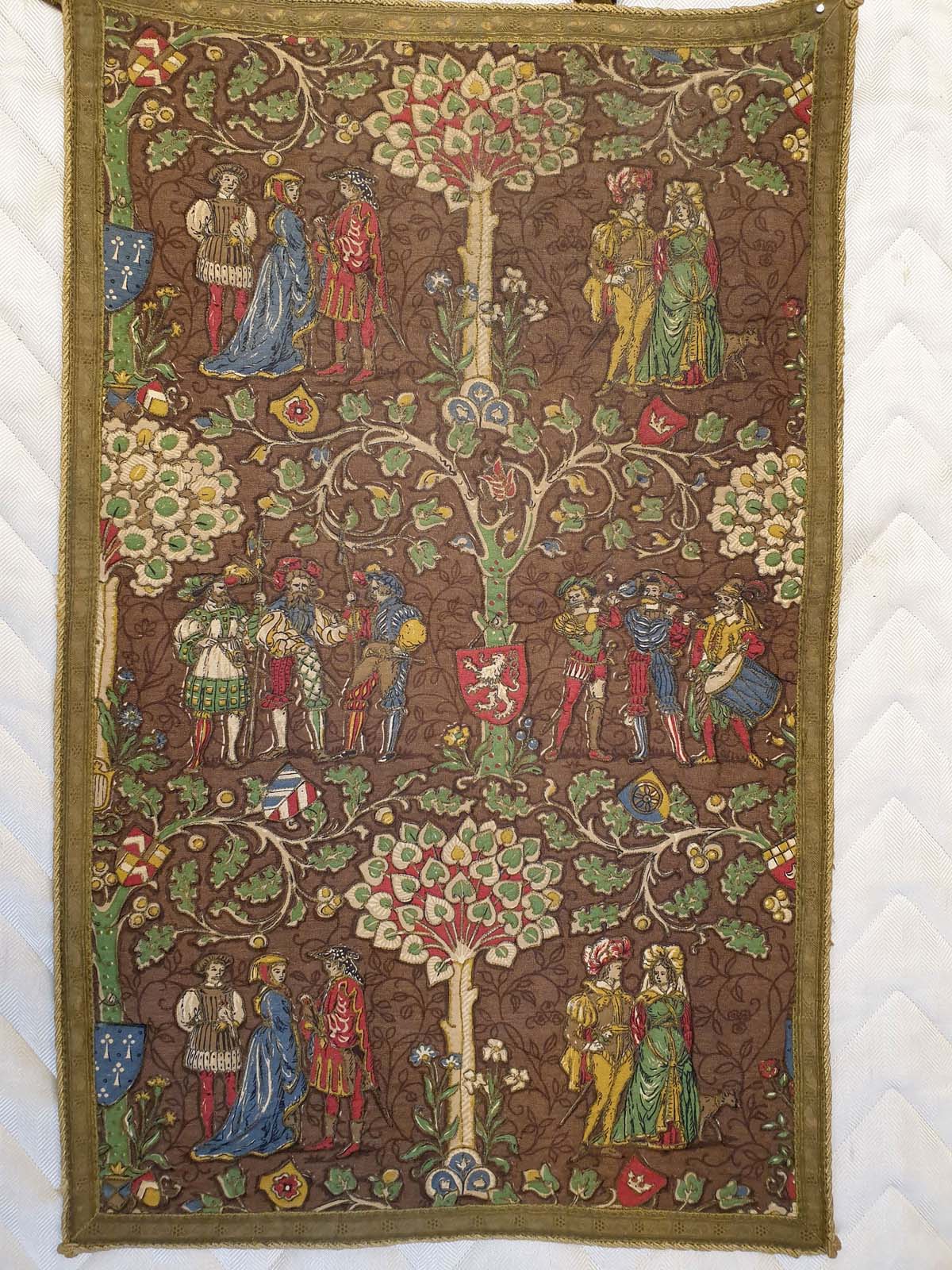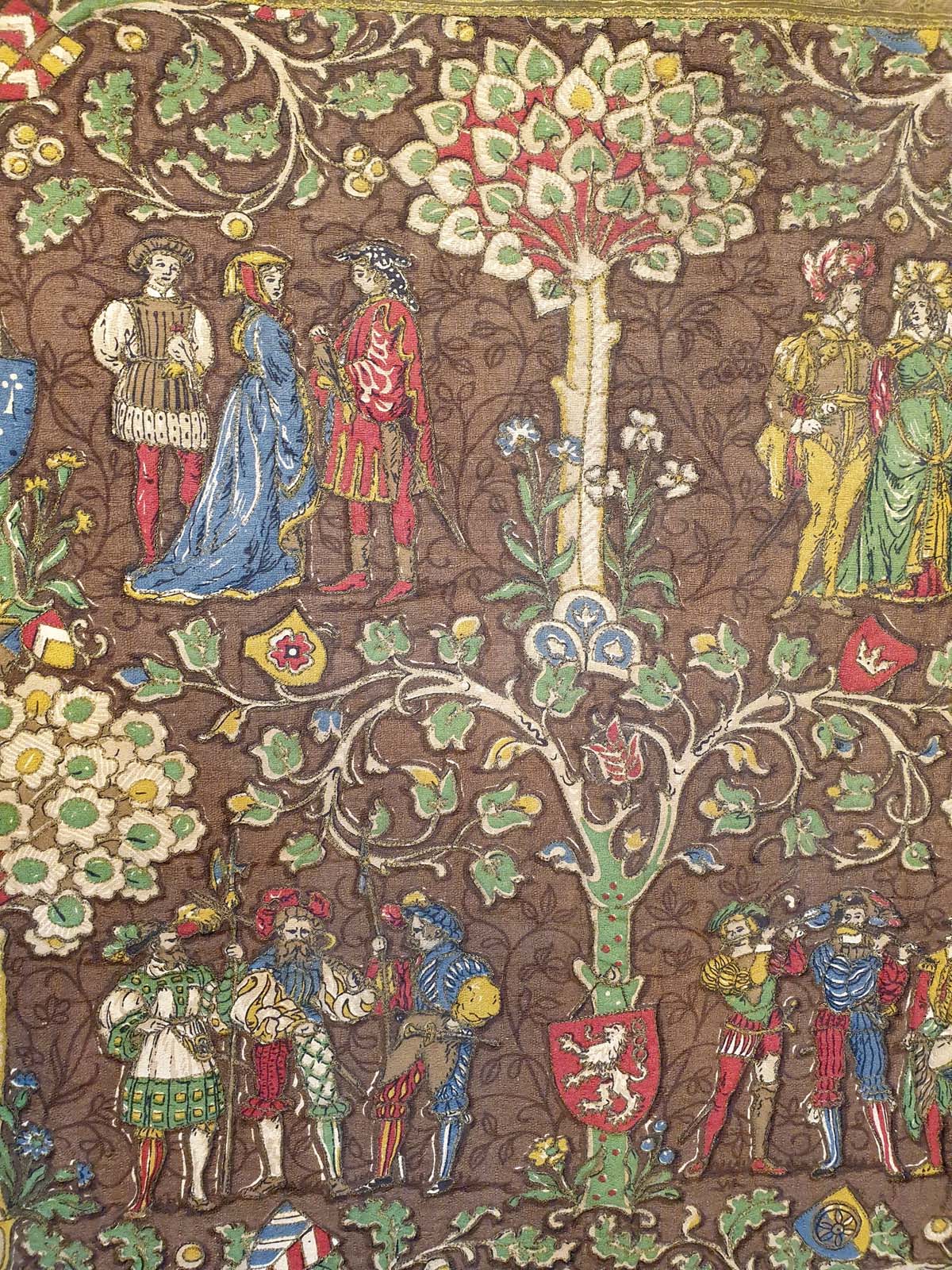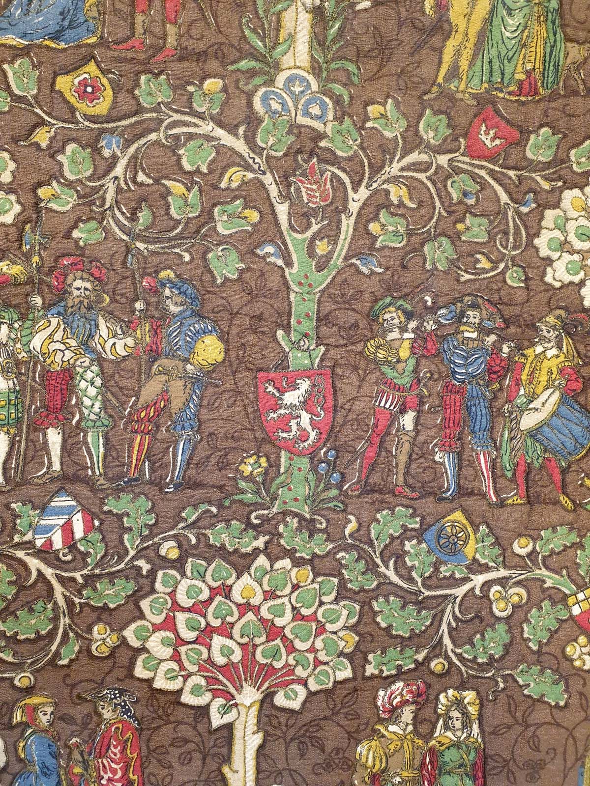 A key visual element is the presence of heraldic shields, including a prominent one with a rampant lion, suggesting noble lineage or specific historical associations, adding to the tapestry's authentic medieval feel. The color palette is deep and earthy, featuring rich browns as a background, complemented by vibrant reds, blues, greens, and gold in the figures and flora, all contributing to its antique charm.
